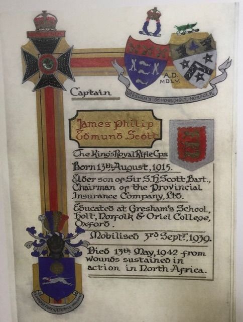 We know about them because between 1946 and 1949 Maurice Conway of Leeds office, in his own time and at his own expense, created a Book of Memories. It’s rather like a medieval manuscript with a separate page for each of the fallen (see Roll of Honour below).