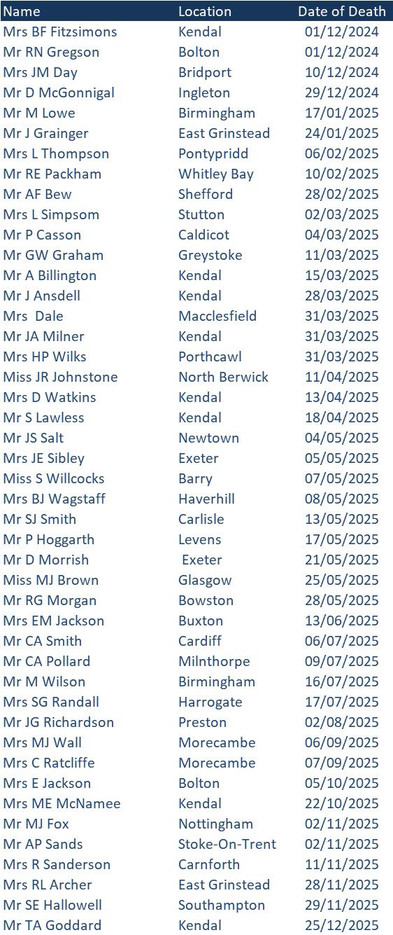 We regret to announce the death of the following members: